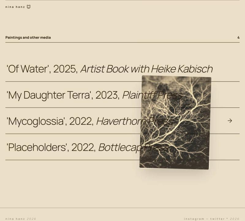 Visit Live SiteA clean, typographically-led portfolio for Nina Hanz — a German-American graduate of the Royal College of Art’s MA Writing programme. The site presents her body of work across essays, criticism, poetry pamphlets, and artist books, published in venues including Vogue, Map Magazine, and Arts of the Working Class.