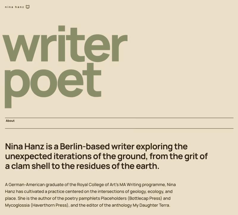 Portfolio website for Nina Hanz, a Berlin-based writer and poet whose work explores geology, ecology, and place. Features her essays, reviews, poetry publications, and artist books.